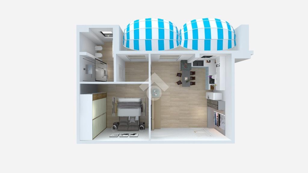 La soluzione è cosi disposta: soggiorno a vista con angolo cottura, disimpegno, camera da letto e bagno.