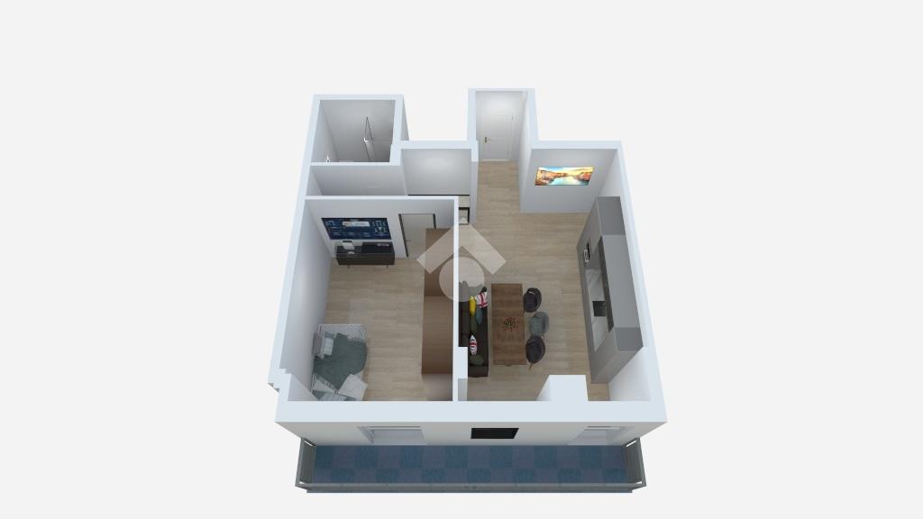 La soluzione è cosi disposta: soggiorno a vista con angolo cottura, disimpegno, camera da letto e bagno.